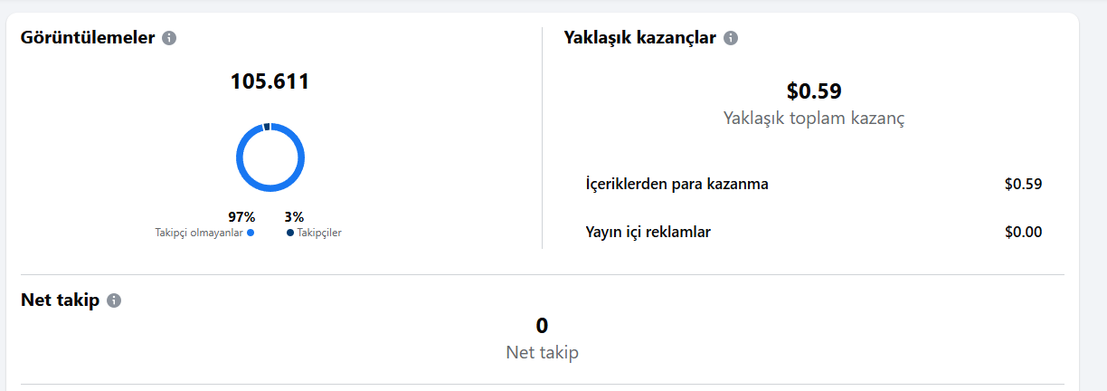 Fotoğrafta yaklaşık 100 bin gösterime 0.59$ kazandığımızı görebilirsiniz. Detaylar için Facebook Para Kazanma Eğitimimizi Ziyaret Ediniz
